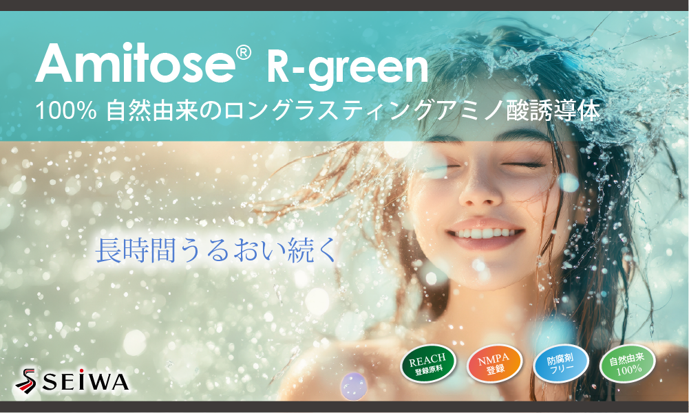 Amitose® R-greenは、アルギニンとグリセリンを結合させた100%自然由来のアミノ酸誘導体で、幅広い用途に適した多機能成分です。独自の構造により、96時間持続する保湿効果を発揮します。