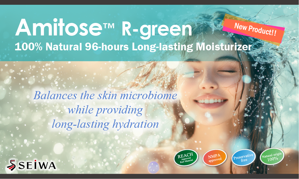 Amitose™ R-green是由精氨酸与甘油结合而成的100%天然来源氨基酸衍生物,是一种适用于广泛用途的多功能成分。凭借其独特结构,可发挥长达96小时的持久保湿效果。此外,在皮肤微生物菌群方面,能够做到不影响有害菌的同时,支持有益菌的增殖。不仅适用于护肤和护发产品,也可应用于头皮护理及私处护理等配方。